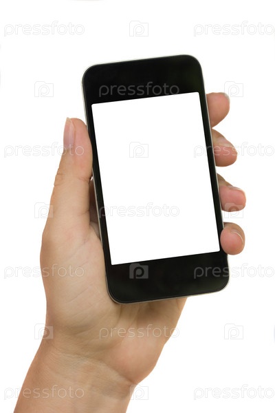 Рука с современным смартфоном, изолированным на белом фоне с пространством для текста