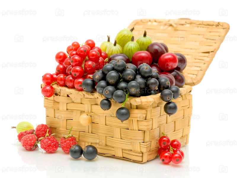Сочные ягоды в плетеной корзине на белом фоне