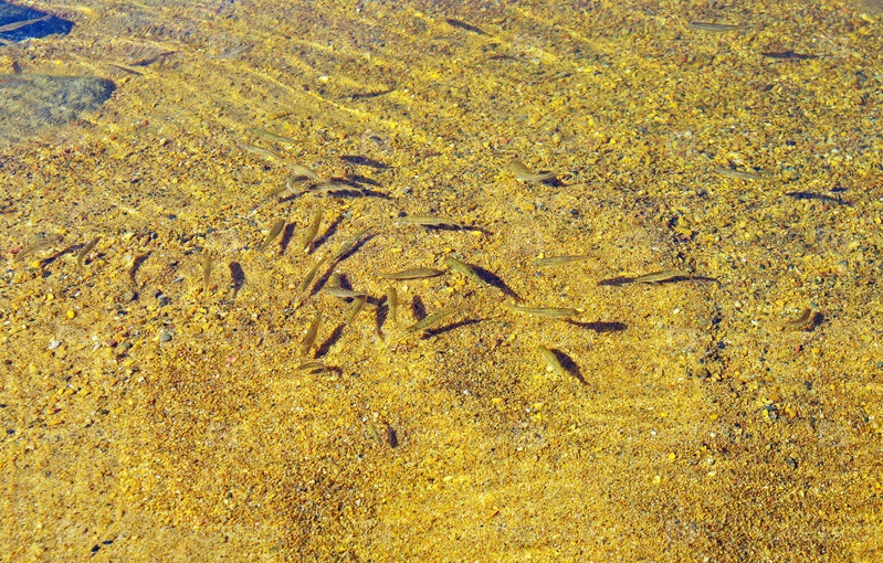 Мальки (предположительно - форель или семга) на мелководье на фоне песчаного дна
