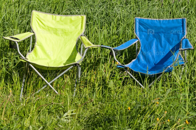Пустые раскладные кресла на зеленой траве