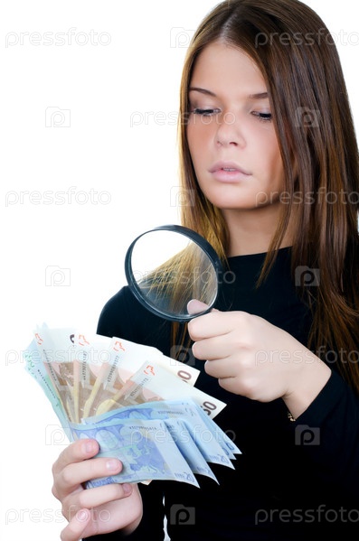 Женщина с увеличительным стеклом и банкнотами евро