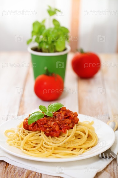 Спагетти болоньезе на белой тарелке на деревянном столе