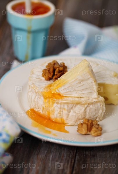 Блюдо сыром, орехами и джемом на деревянном столе