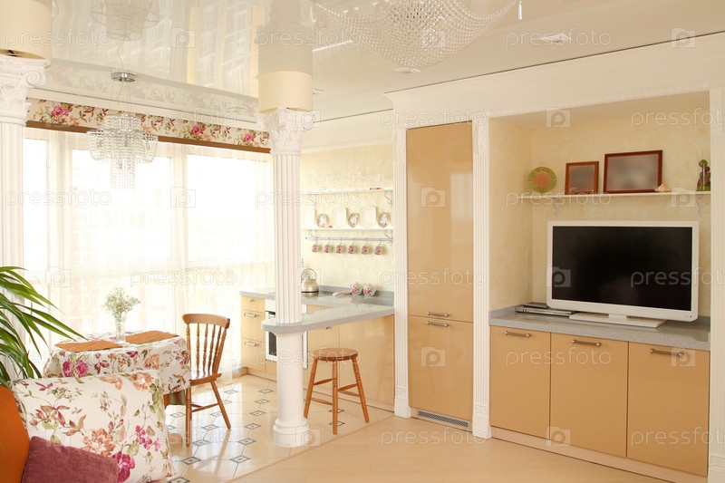Интерьер современной квартиры с видом на кухню и комнату с телевизором