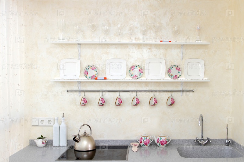 Интерьер современной кухни с плитой, раковиной и полкой с тарелками