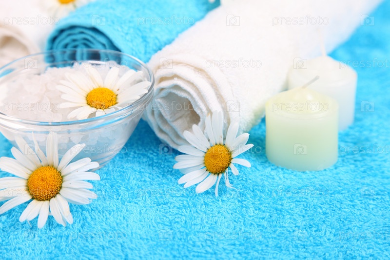 Натюрморт с морской солью, ромашками и полотенцами