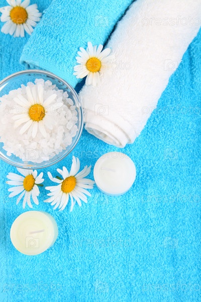 Натюрморт с морской солью, ромашками и полотенцами