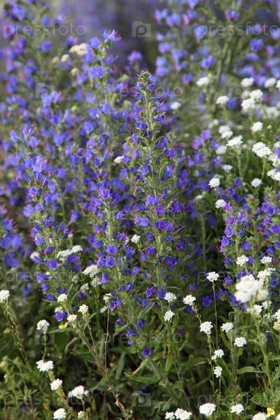 Цветущий луг крупным планом. Белые и голубые цветы