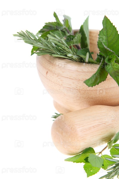 Розмарин и мята в деревянной ступке