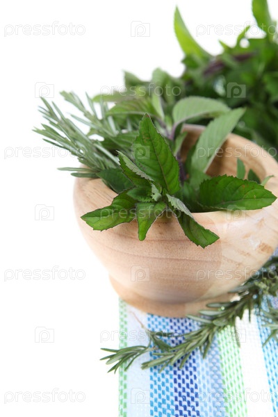 Розмарин и мята в деревянной ступке