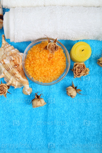 Красивый спа-натюрморт с сухими розами, морской солью и полотенцами
