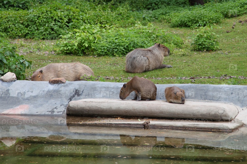 Капибары у воды в зоопарке
