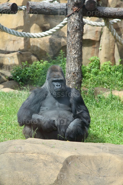 Горилла сидит на траве в зоопарке