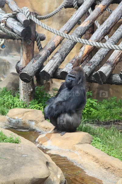 Горилла сидит на траве в зоопарке