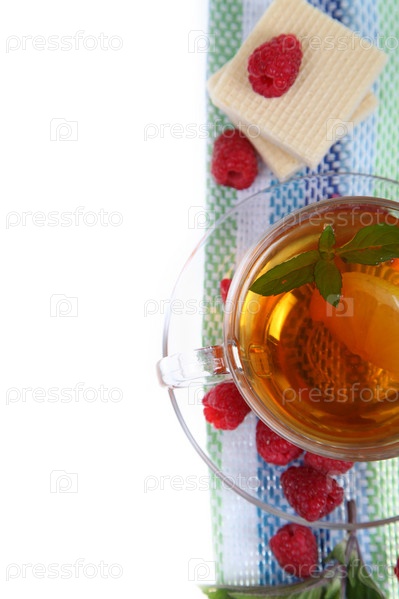 Чай с малиной, вафли и мята на столе