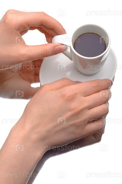Две руки держат чашку кофе на белом фоне