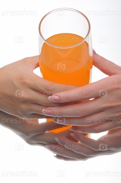 Две руки со стаканом апельсинового сока на белом фоне