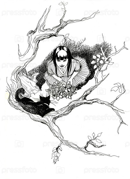 Девочка с цветами и черный кот на дереве