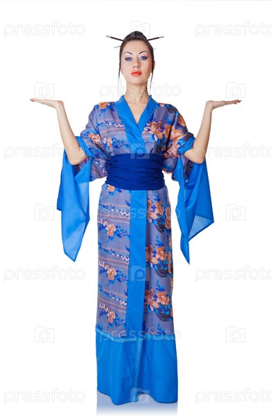 Молодая женщина в японском кимоно на белом фоне