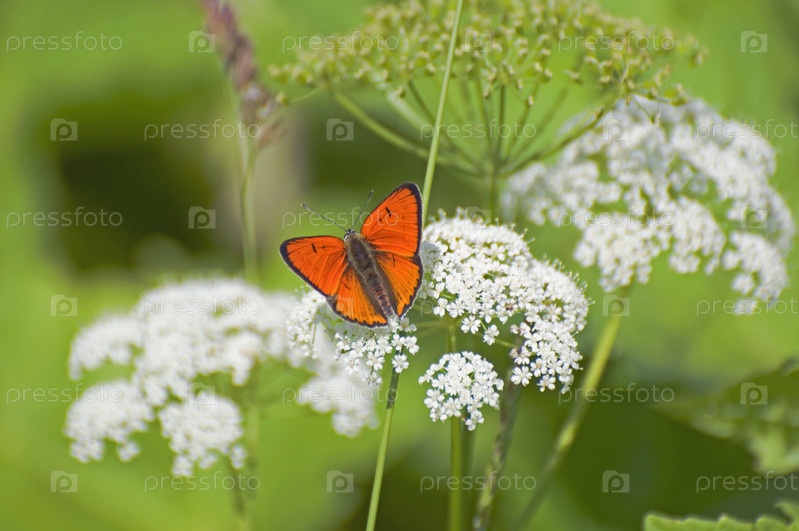 Бабочка Непарный красник сидит, раздвинув крылья, на белых пушистых цветах