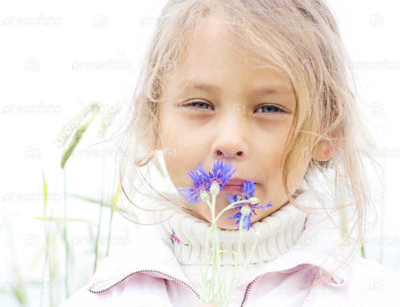Маленькая девочка с васильком на поле