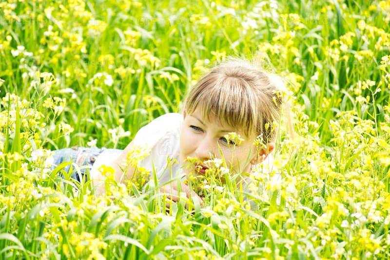 Молодая женщина лежит на траве и нюхает цветы