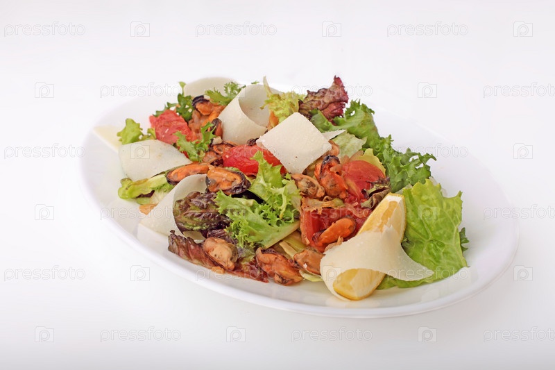 Салат с морепродуктами, пармезаном и помидорами на белом фоне