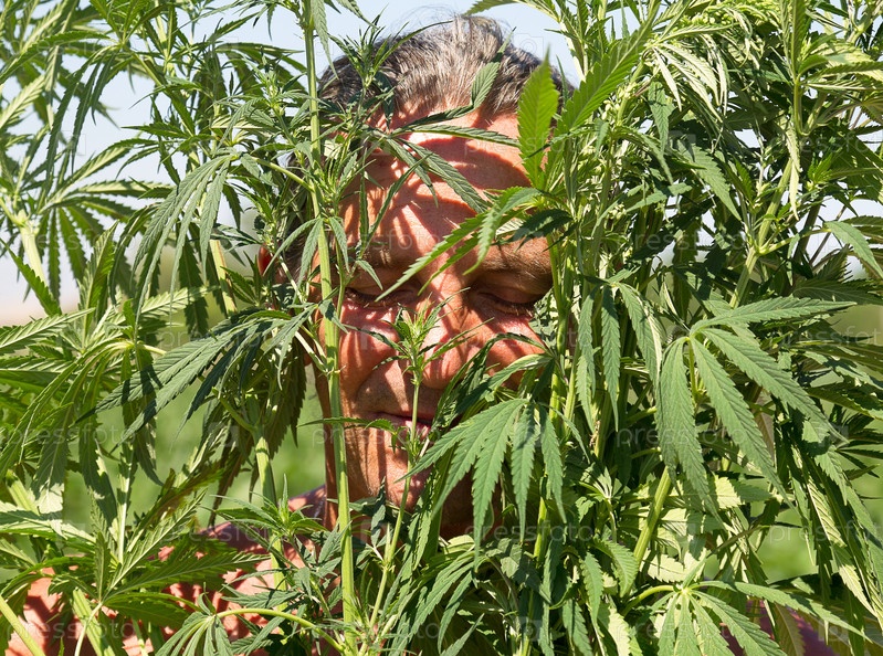 Загорелый человек в кустах конопли с солнечный летний день