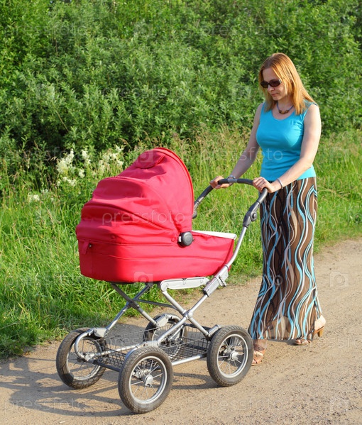 Сорокалетняя мама гуляет с детской коляской