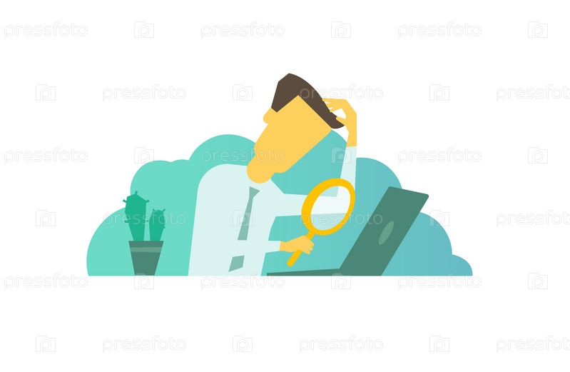 Бизнесмен с лупой в руке, глядя на что-то в ноутбуке