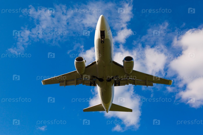 Вид снизу на белый реактивный пассажирский самолет