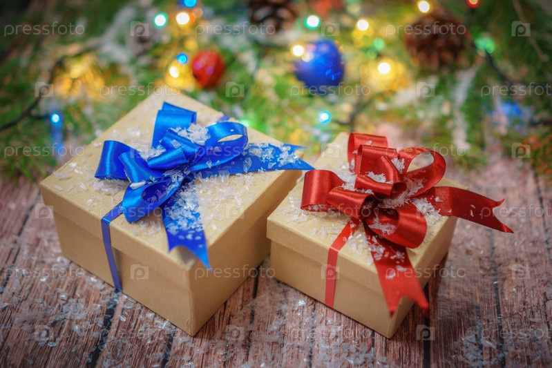 Коробки с подарками на фоне еловых веток, шишек и гирлянд