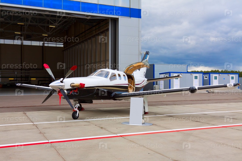 Частный винтовой самолет с одним двигателем на фоне ангара