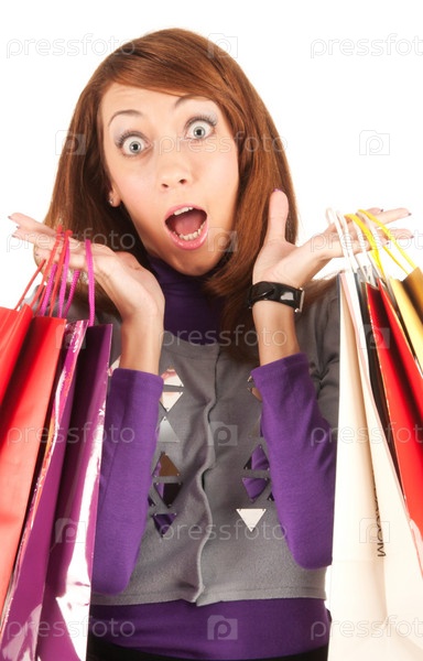 Удивленная молодая женщина с пакетами, изолированная на белом