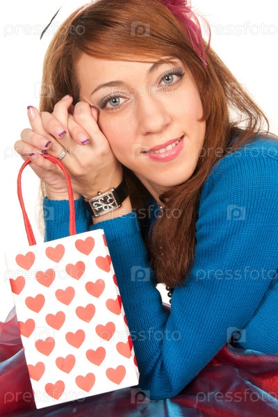 Молодая женщина с пакетом, изолированная на белом