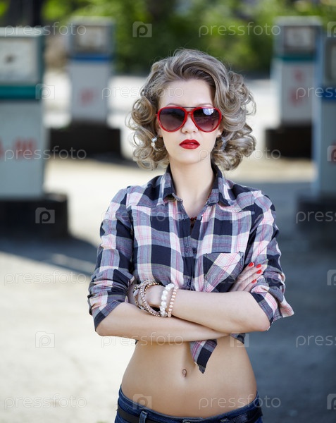 Портрет молодой красивой блондинки на заправочной станции с бензоколонками на заднем плане