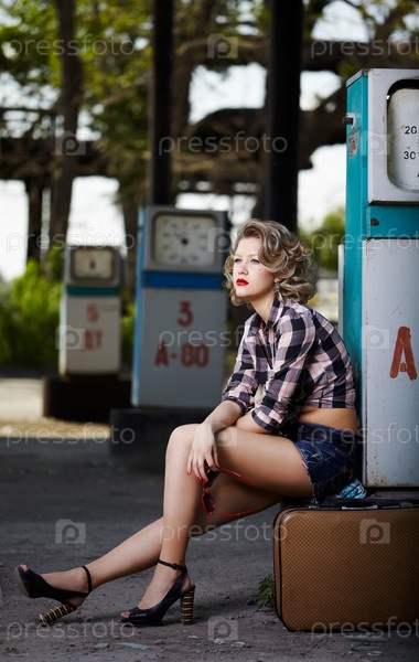 Портрет молодой красивой блондинки, сидящей на бензоколонке с чемоданом