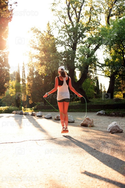 Красивая стройная девушка прыгает через скакалку в парке утром