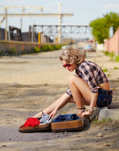 Портрет молодой красивой блондинки, сидящей на обочине дороги и путешествующей автостопом