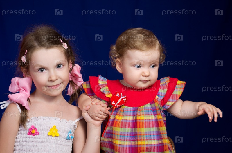 Симпатичная девочка держит за руку свою сестренку