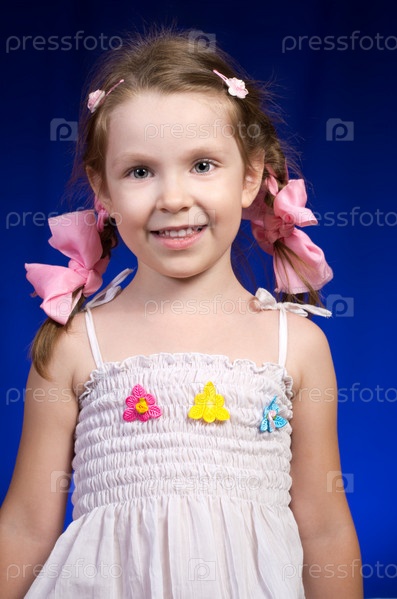 Портрет смешной симпатичной девочки с косичками и бантиками