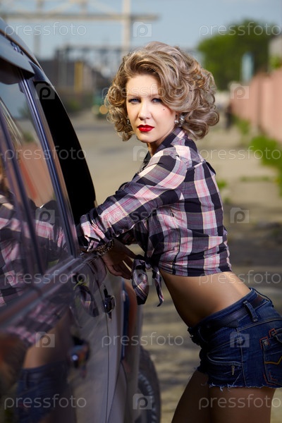 Портрет красивой блондинки, флиртующей с водителем, путешествуя автостопом