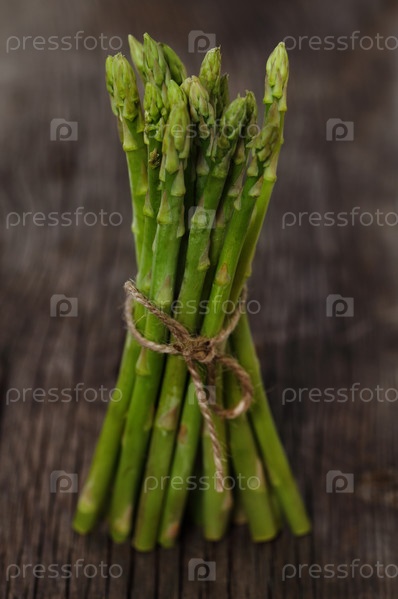 Свежие зеленые побеги спаржи на деревенском деревянном столе