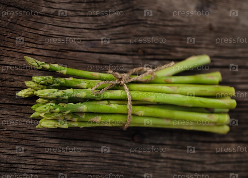 Свежие зеленые побеги спаржи на деревенском деревянном столе