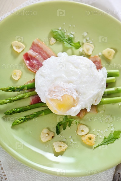 Салат из зеленой спаржи с яйцом пашот и ветчиной