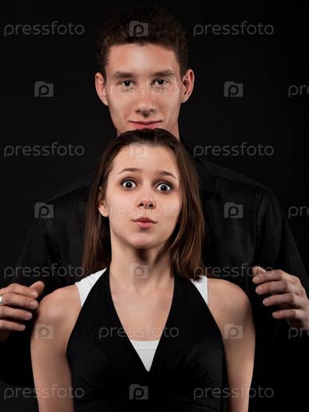Портрет молодой смешной влюбленной пары на темном фоне