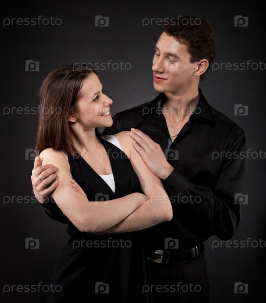 Портрет молодой влюбленной пары на темном фоне