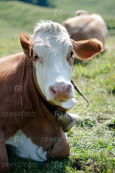 Коровы пасутся летом в Баварских Альпах, окруженные мухыми