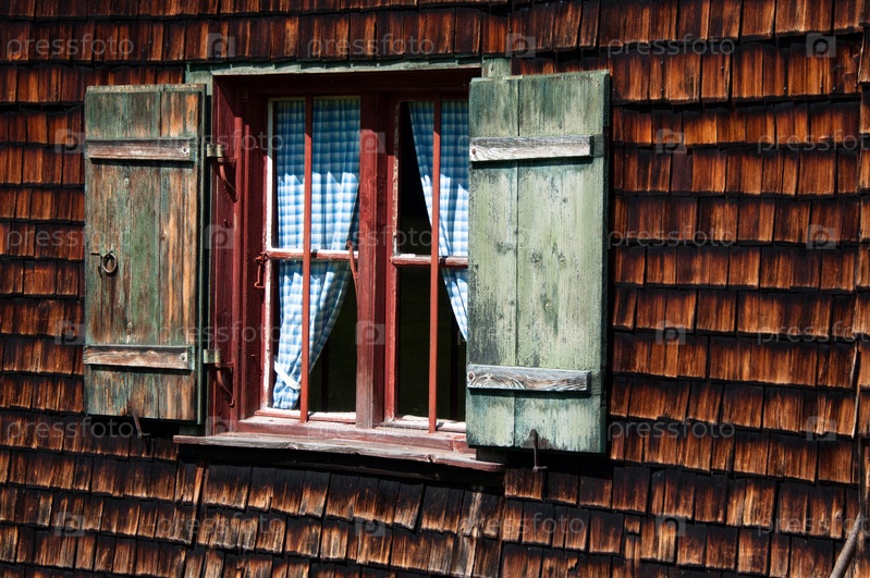 Окно идиллического альпийского коттеджа, отделанного деревянными панелями, в Баварских Альпах