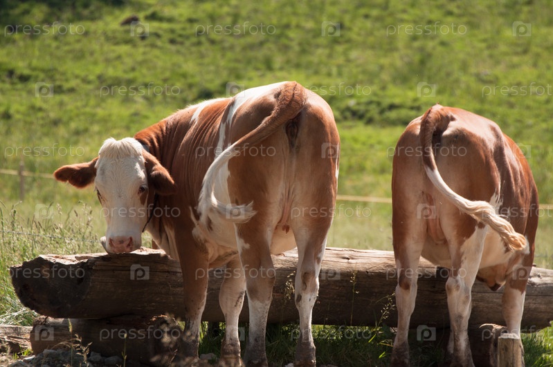 Две коровы пьют воду из корыта в Альпах
